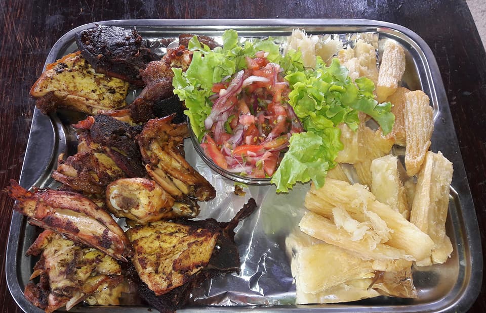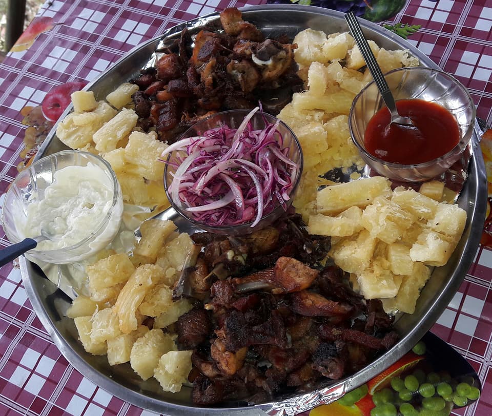 Pollo, carne, salchicha, yuca frita, papas fritas, ensalada, guayusa.